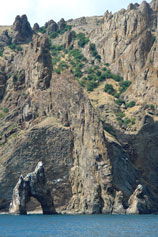 Карадаг - красивейший уголок Крыма читать о потушем вулкане Карадаг. Эта красота особенная, не типичная для излюбленных туристами центральной и западной частей Южного берега. На Карадаге все дико, хаотично, сурово и труднодоступно. Здесь не найти спокойных горизонтальных линий. Черные многосотметровые обрывы нависают над бирюзовыми бухтами, в которые можно проникнуть лишь с моря. Стены глубоких ущелий гигантскими ступенями поднимаются к далекому голубому небу. Причудливые фигуры изваяны ветром и непогодой в мощных пластах вулканических туфов. Среди них есть Шайтан, Пряничный конь, Сокол, Король, Королева и даже Трон, нависший над бездной.